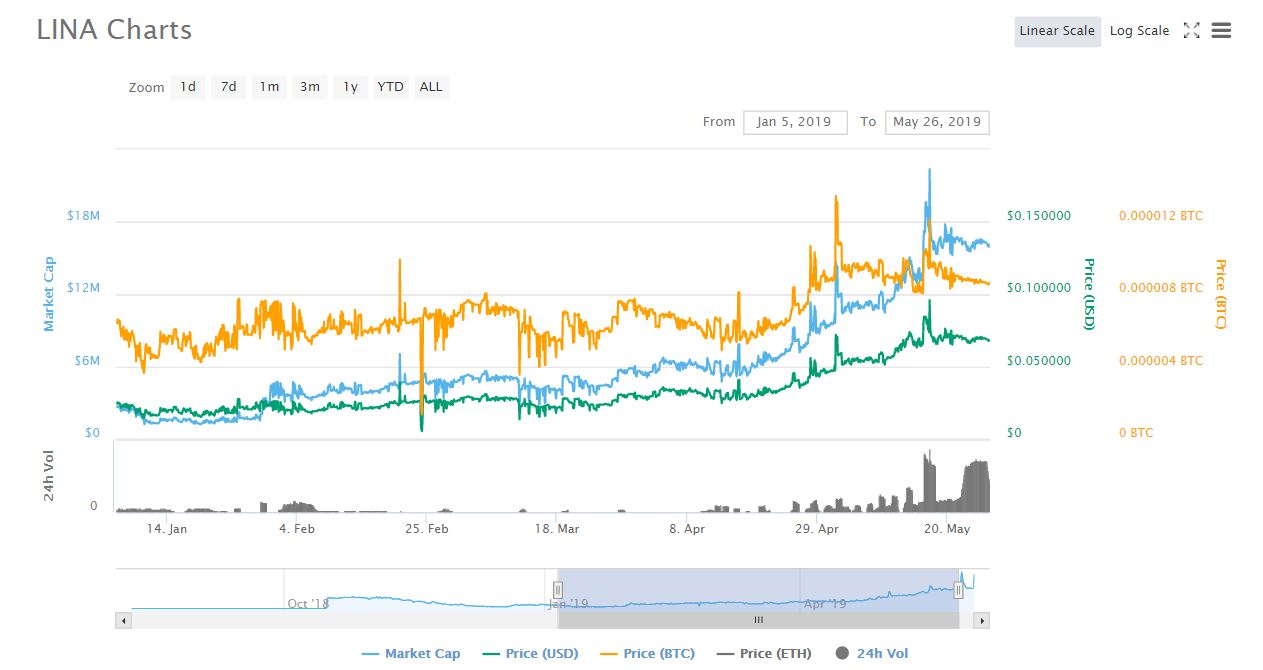 Với các nỗ lực đó, LINA đã được cộng đồng ghi nhận thông qua các chỉ số volume giao dịch và giá LINA token tăng dần đều lên tới 300% trong 5 tháng đầu năm 2019.