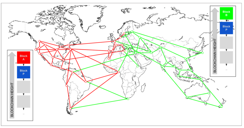 Vấn đề mâu thuẫn xảy ra là vì khoảng cách địa lý, cùng một thời điểm các nút sẽ lưu trữ 2 phiên bản blockchain khác nhau. Ví dụ như hình trên, các nước ở châu Mỹ đang có chuỗi blockchain là …P →A, còn các nước châu Á có chuỗi blockchain là …P →B. Việc mining lúc này vẫn diễn ra bình thường.